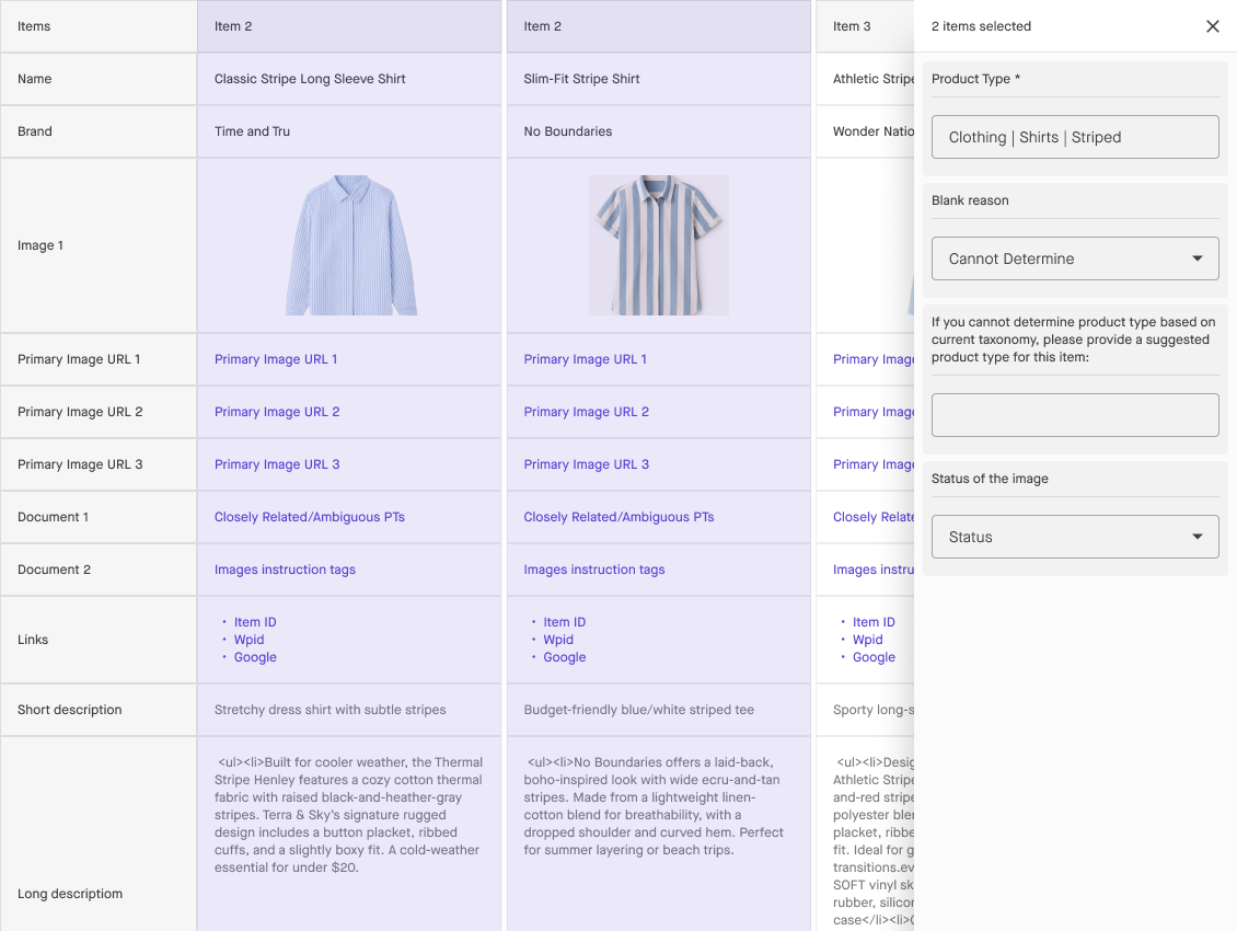 Some workflows involve single-item decisioning, where reviewers evaluate each record independently. Others use bulk or table-based workflows to maximize throughput for consistent catalogs. Comparative workflows support decisions between candidate categories or the evaluation of model suggestions.
