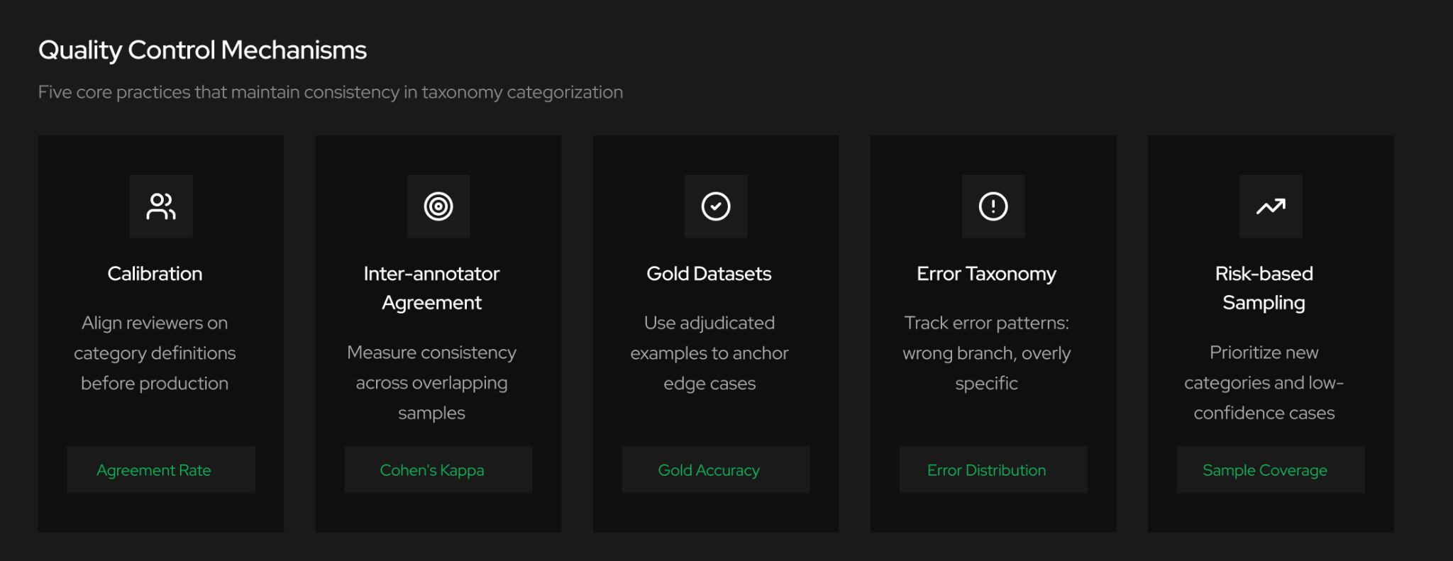 Quality control in taxonomy categorization depends on clear labeling rules, reviewer calibration, agreement measurement, and continuous QA sampling. When these controls weaken, inconsistency and drift quickly follow.